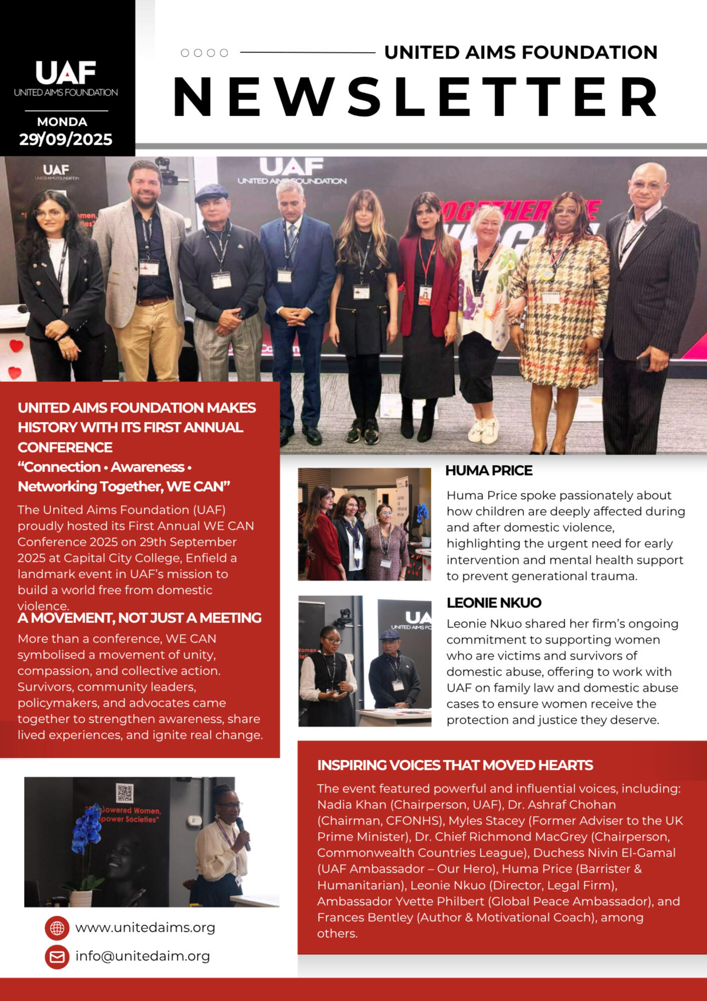The United Aims Foundation (UAF), established in 2023 and headquartered in London, UK, is a dedicated women’s empowerment organisation.Under the leadership of Chairperson Nadia Khan, UAF aims to support and uplift women through a variety of initiatives. The foundation focuses on providing mentorship, resources, and opportunities to help women excel in various aspects of life.UAF was created to support victims of domestic violence, combat gender inequalities and foster a supportive community where women can build confidence, acquire skills, and achieve professional growth.Through events, sponsorship programs, and partnerships, UAF works to equip women with the tools they need to succeed.