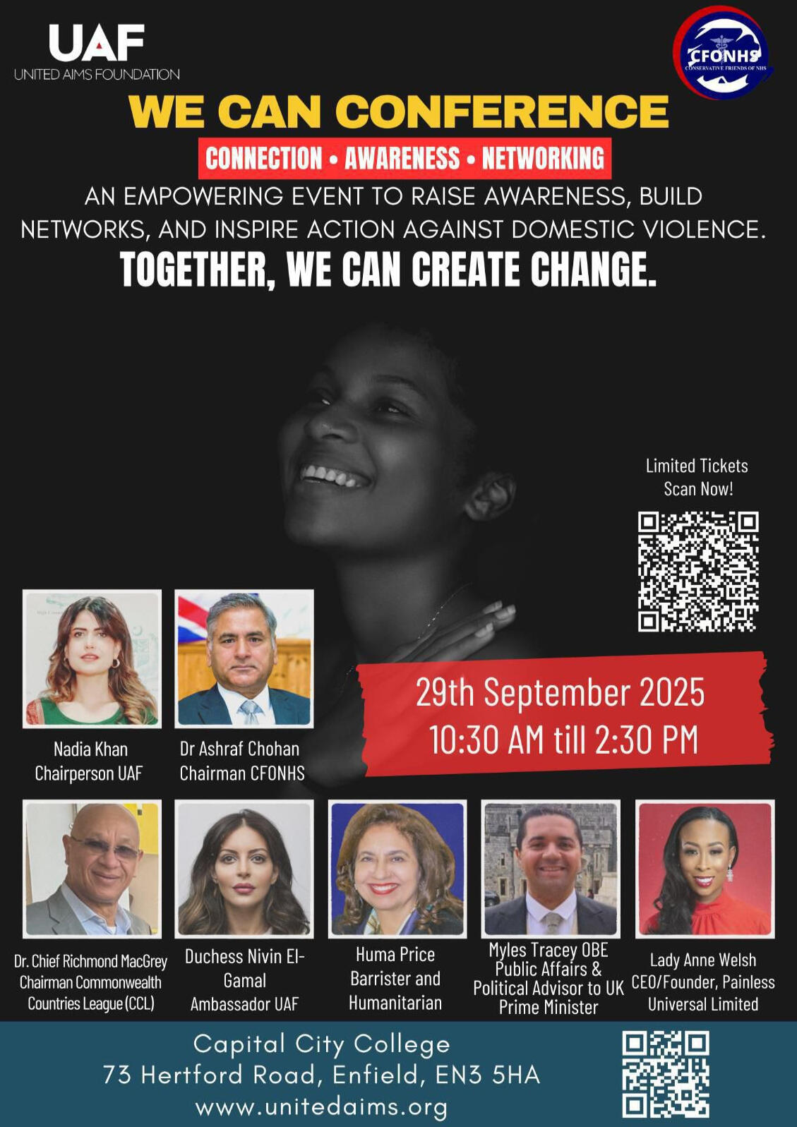 United Aims Foundation (UAF), proudly hosted the WE CAN Conference 2025 at Capital City College, Enfield. The event brought together inspiring leaders, experts, and survivors to raise awareness and drive action against domestic violence. Attendees engaged in powerful discussions, shared experiences, and strengthened community networks to support survivors. Together, we took a vital step toward building a safer, violence-free society.