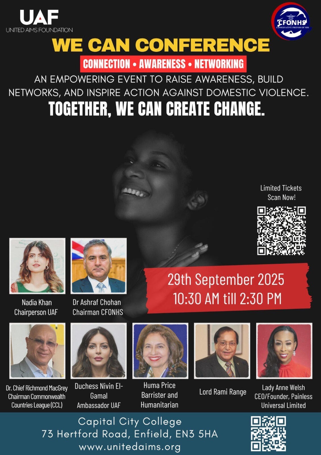 📍 Location: Capital City College, 73 Hertford Road, Enfield, EN3 5HAJoin United Aims Foundation (UAF) for a half-day conference dedicated to raising awareness, empowering survivors, and driving action against domestic violence.This powerful event aims to shine a light on the realities of domestic violence, create meaningful dialogue, and unite communities to take a stand against abuse.Together with our partners, CFONHS, we are building stronger networks and amplifying the voices of survivors and support networks to create lasting change.The WE CAN Conference 2025, is more than just a gathering it is a call to action.Why Attend?