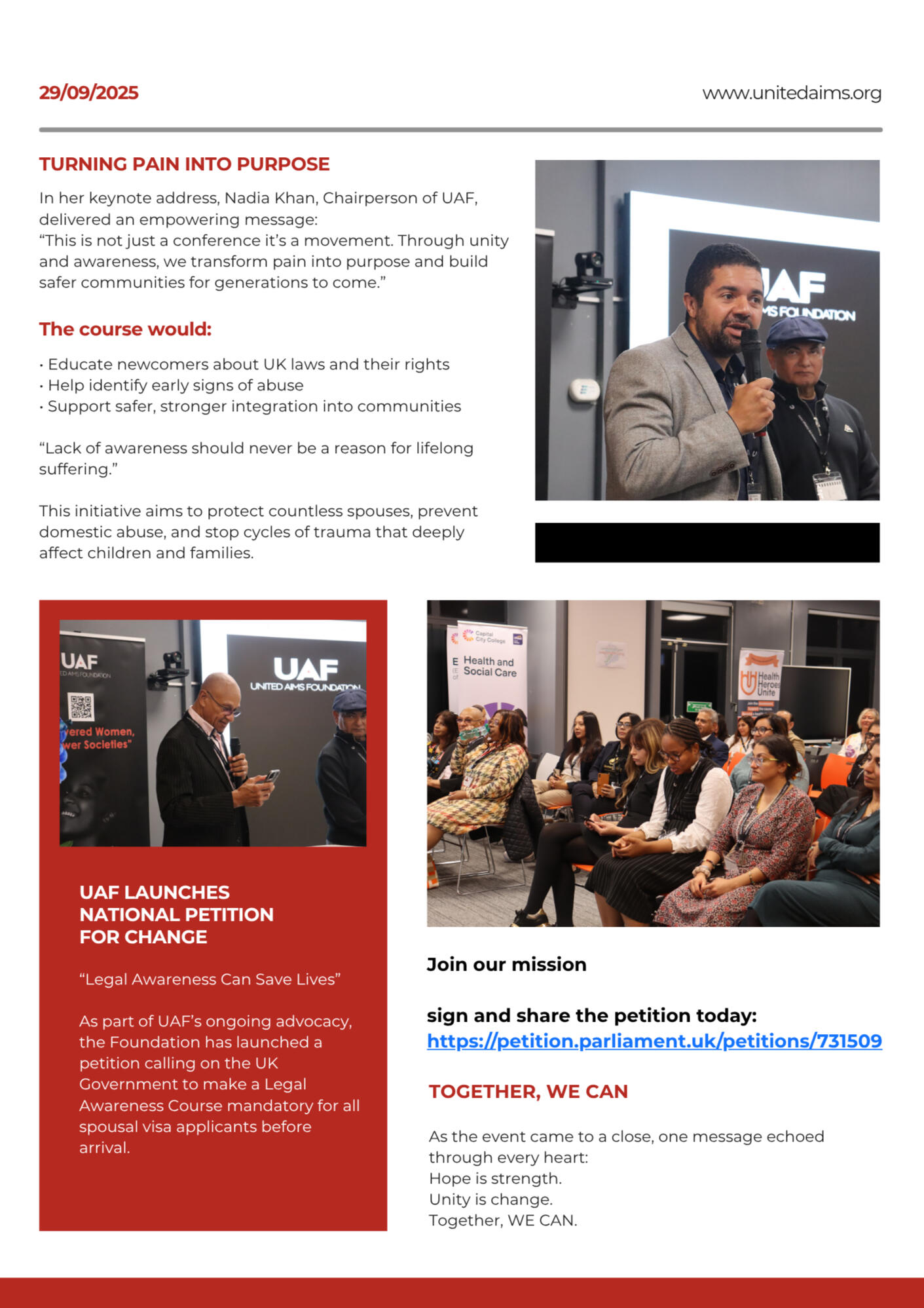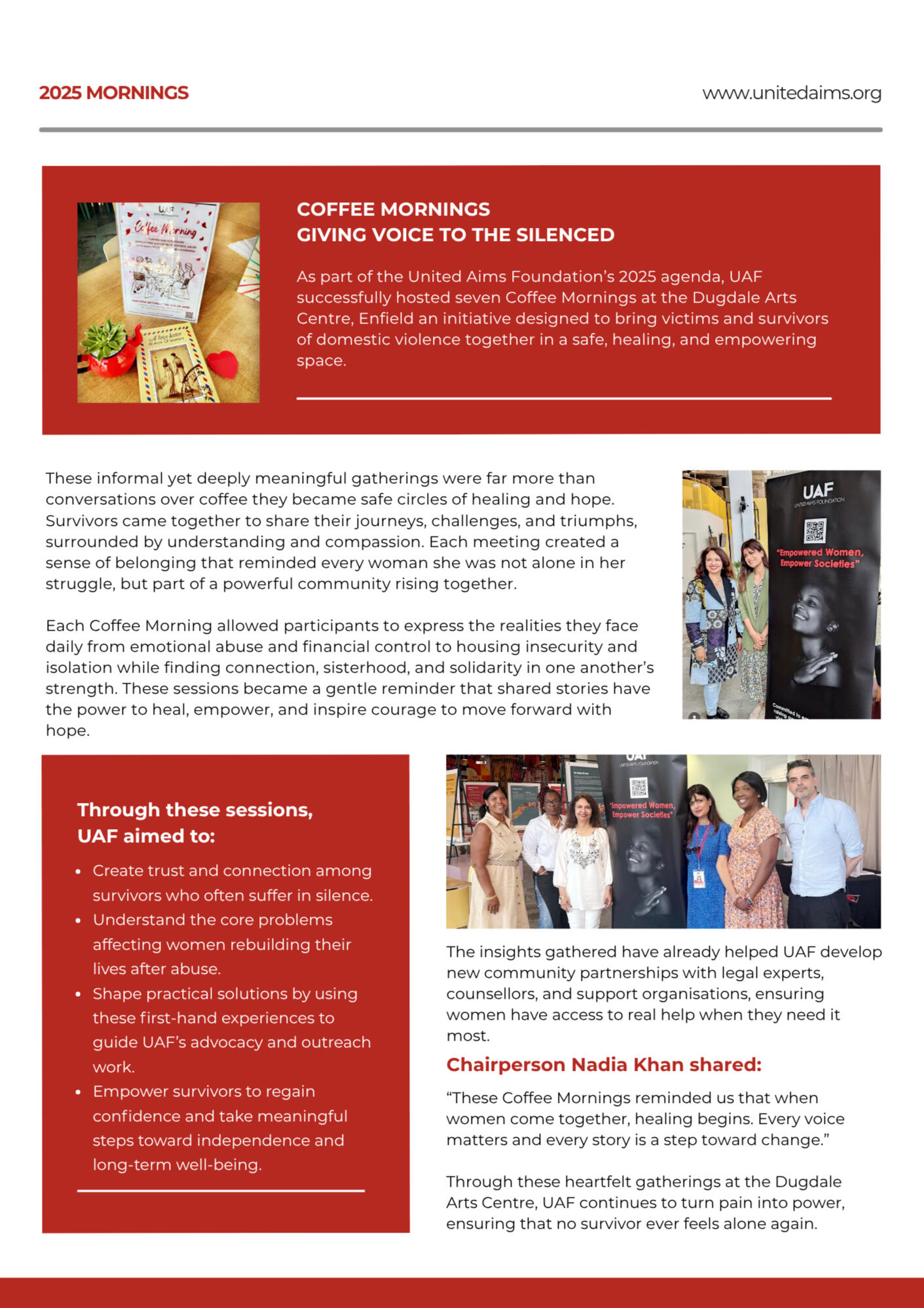 The United Aims Foundation (UAF), established in 2023 and headquartered in London, UK, is a dedicated women’s empowerment organisation.Under the leadership of Chairperson Nadia Khan, UAF aims to support and uplift women through a variety of initiatives. The foundation focuses on providing mentorship, resources, and opportunities to help women excel in various aspects of life.UAF was created to support victims of domestic violence, combat gender inequalities and foster a supportive community where women can build confidence, acquire skills, and achieve professional growth.Through events, sponsorship programs, and partnerships, UAF works to equip women with the tools they need to succeed.